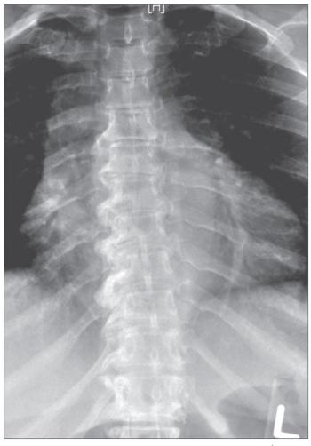 DISH, a radiographic finding characterized by abnormal calcification and ossification in the axial skeleton and in ligaments and entheses,1 most often affects the thoracic spine. Of note, the findings almost always are more prominent on the right side (the left side may be spared because of aortic pulsations). The enthesopathy, also called“whiskering,” can affect the pelvic brim, ischial tuberosities, greater trochanters, and other features that have ligamentous attachments.2 Diagnosis often is made after an incidental finding in an asymptomatic patient.