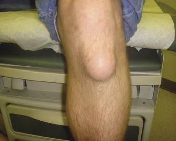 For 2 months, a 29-year-old man had pain and circular, soft swelling (7 x 7 cm in diameter) over the anterior left knee, superficial to the patellar ligament. Pain was minimal and associated with extension and flexion).