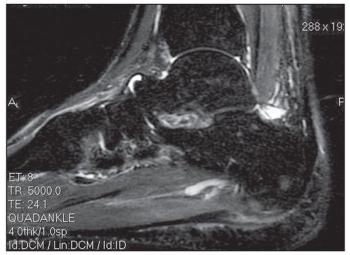 A 31-year-old Asian man presented for evaluation of left foot pain that began on the day before his clinic visit while he was practicing parkour (the physical discipline of training to overcome obstacles within one’s path by using only the human body and objects in the environment). He had no significant medical history. The patient recalled leaping from a platform toward a horizontal bar attached to a wall a few feet away. During the lift-off phase of the jump, he experienced a snapping sensation in his left foot, with subsequent pain in the arch and heel. Immediately after this event, he was unable to ambulate.