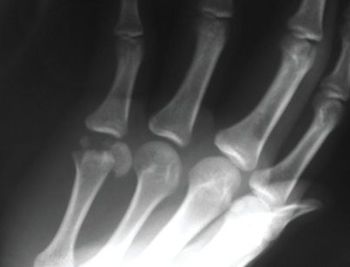 An 18-year-old complained of pain and decreased mobility of the small finger in his right hand after a softballinjury. While sliding back to second base during a pickoff attempt, the patient hit his hand on the bag.