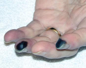 A 56-year-old man presented with a 1-week history of digital tip ulcers and ischemic gangrene. He alsoreported the recent onset of Raynaud phenomenon and diffuse joint pain.